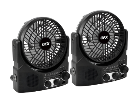 2 Ventiladores de ángulo ajustable, recargable de 6 pulgadas Reproduce música por Bluetooth, unidades USB, tarjetas TF, o simplemente disfruta de Radio FM y AM Marca: QFX Modelo: R-53 6″ 3 paletas de ventilador Funciones: – Ventilador 3 velocidades – Altavoz – Luz LED lateral con tres niveles de iluminación – Radio FM y AM – Transmite música a través de Bluetooth – Panel solar integrado – Antena Telescópica – Conector de entrada auxiliar – Ranura para tarjeta Tf – Ranura USB – Indicador led de alimentación – Indicador led de carga – Conector de entrada de 5V CC – Botón de encendido/apagado y volumen – Reproducción/pausa La batería interna se puede recargar a través de la entrada de alimentación USB de 5 VCC mediante el cable USB incluido. Tiempo de trabajo: – Potencia maxima: 1-2 horas – Potencia minima: 3-4 horas Se entrega desarmado en caja.