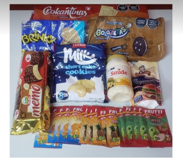 Combo confeccionado con: 2 paquetes de galletas rellenas de 12 unidades cada una,1 paquete de galletas de leche o mantequilla de 8 unidades, 1 paquete de galletas forradas de chocolate y rellenas de malvaviscos de 10 unidades, 1 paquete de galletas de sal de 7 unidades, 1 mayonesa de 200g y otra de 500g además de 15 refrescos instantáneos de 2L de varios sabores. Con todo esto puede cubrir casi la totalidad de las meriendas del mes.